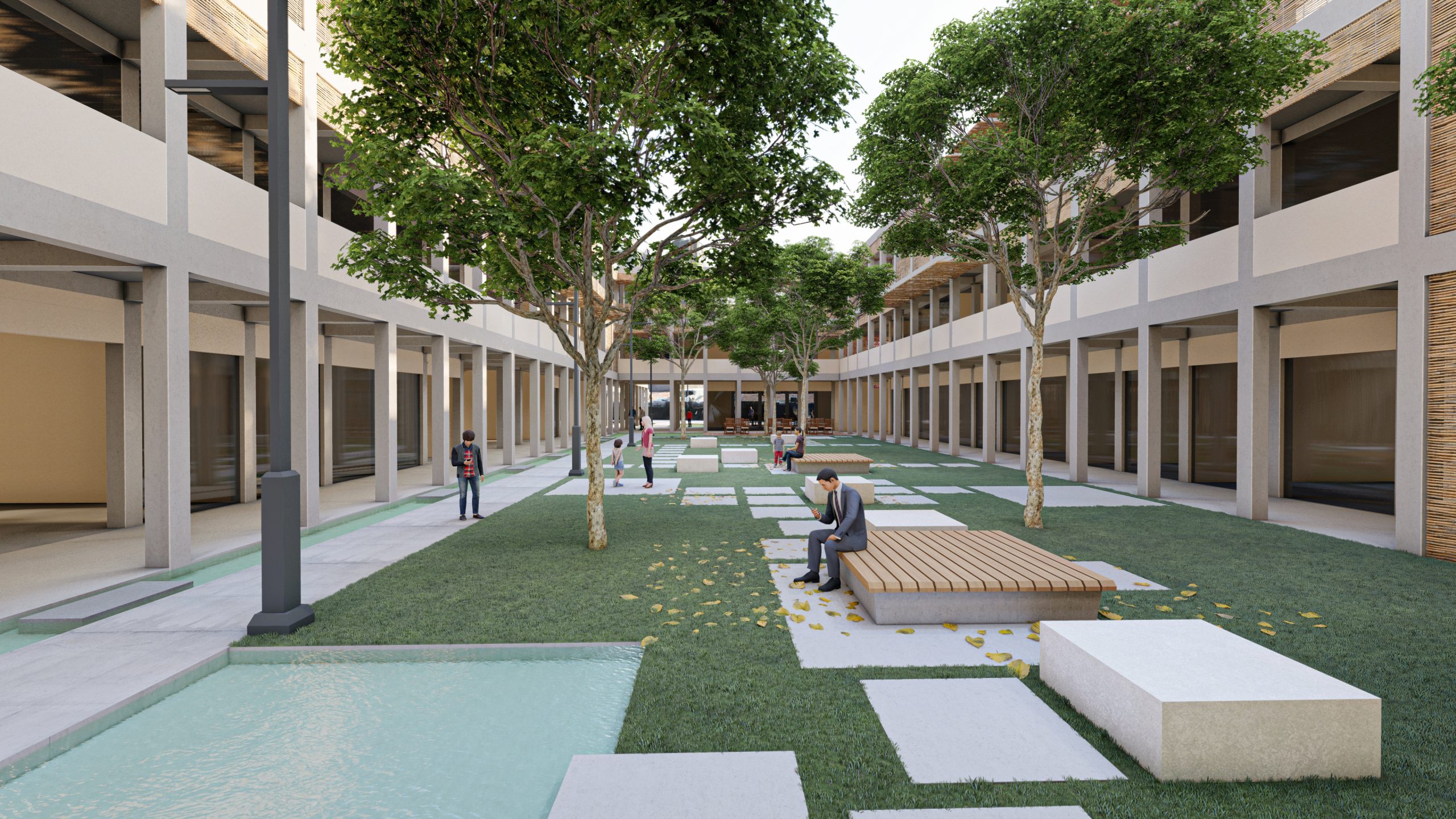 An inner courtyard, supported by restaurants at ground level, functions as an open and accessible public space. This area draws in flows from the street, supporting everyday activities like resting, gathering, and dining.