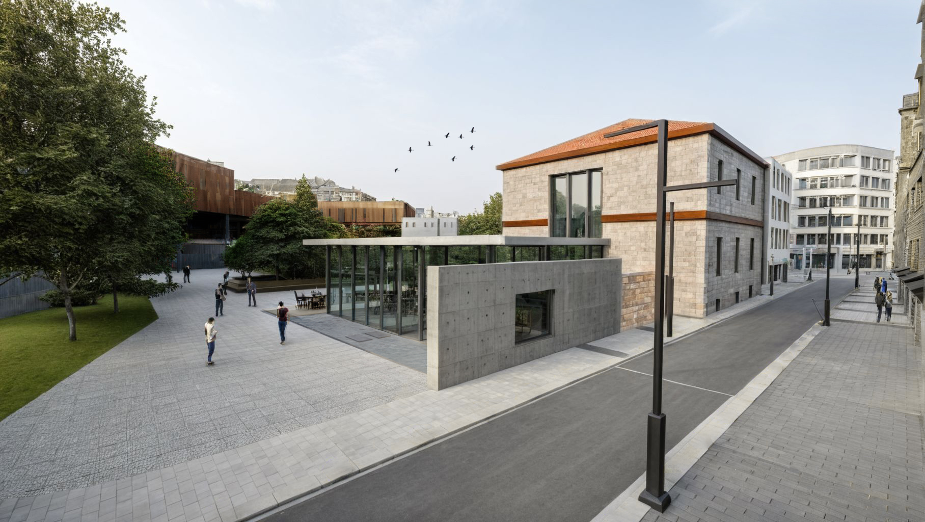 With a respectful yet non-mimetic approach to its historical surroundings, the building establishes both visual and physical connection with the square through its eaved roof, permeable façade, and modest scale. Constructed using contemporary materials such as glass, steel, and exposed concrete, the structure achieves a contemporary presence.