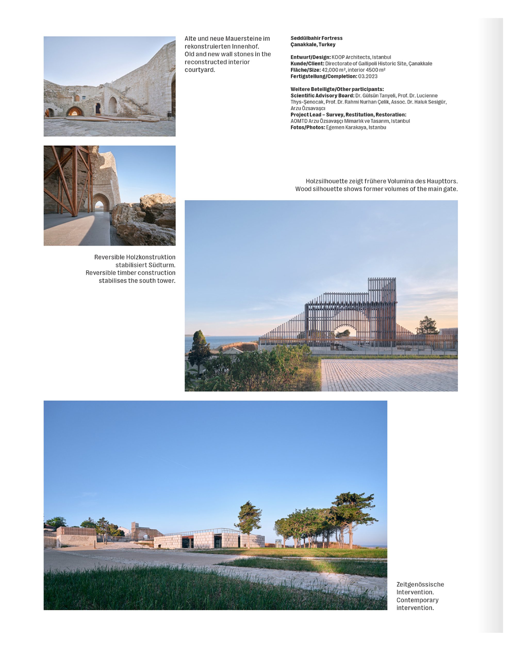 Published in German and English, the book highlights the Seddülbahir Fortress as an exemplary adaptive reuse project distinguished by its minimal intervention in the historical fabric, use of local materials, and ecological landscape strategies. Bringing together existing ruins with a contemporary architectural approach, the project has gained international recognition for its sustainability– and conservation-oriented design.