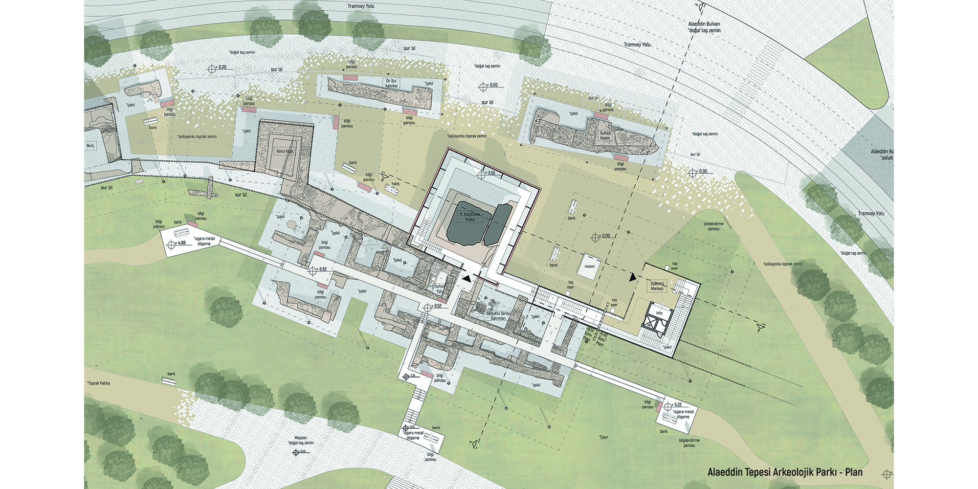Bugün büyük yeşil bir park içinde tekil birkaç nitelikli yapı ve arkeolojik alanlardan oluşan Alaeddin Tepesi’nin kültürel katmanlarının arkeolojik özelliği yerin ruhunun görülebilir bir parçası olma potansiyeline sahip. Bununla birlikte fiziksel olarak yok olmuş, belge, fotoğraf ve kişilerin hafızalarında kayıtlı çok katmanlı bir miras var. Bunları ortaya çıkarmak üzere yapıların özgün kotlarına inerek kentsel arkeolojik peyzaj alanları yaratmak, yok olan izleri de işlevselleştirerek canlandırmak ya da başka araçlarla hatırlatmak tasarım yaklaşımımızın ana ilkelerinden oldu. Arkeolojiye mesafe alan, yabancılaştıran, sadece bilimsel veya turistik bir imge haline getiren, dokunulmaz kılan bir şehir değil, arkeolojisiyle yaşayan bir Konya hayal ettik.